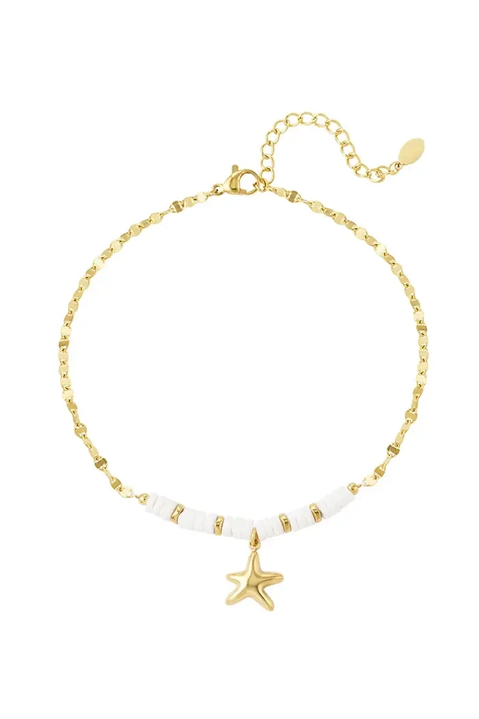 Enkelbandje zeester goud gecombineerd met witte kraaltjes.