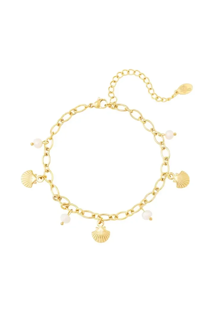 Enkelbandje met schelpjes en wite pareltjes. Goudkleurig.