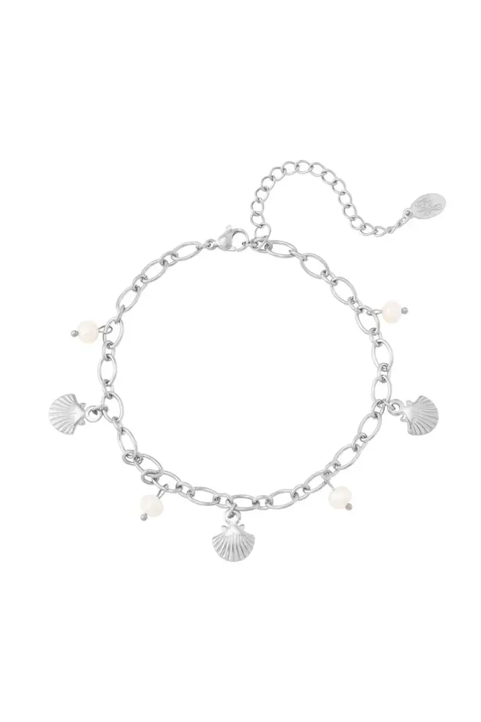 Enkelbandje met schelpjes en wite pareltjes. Zilver kleur