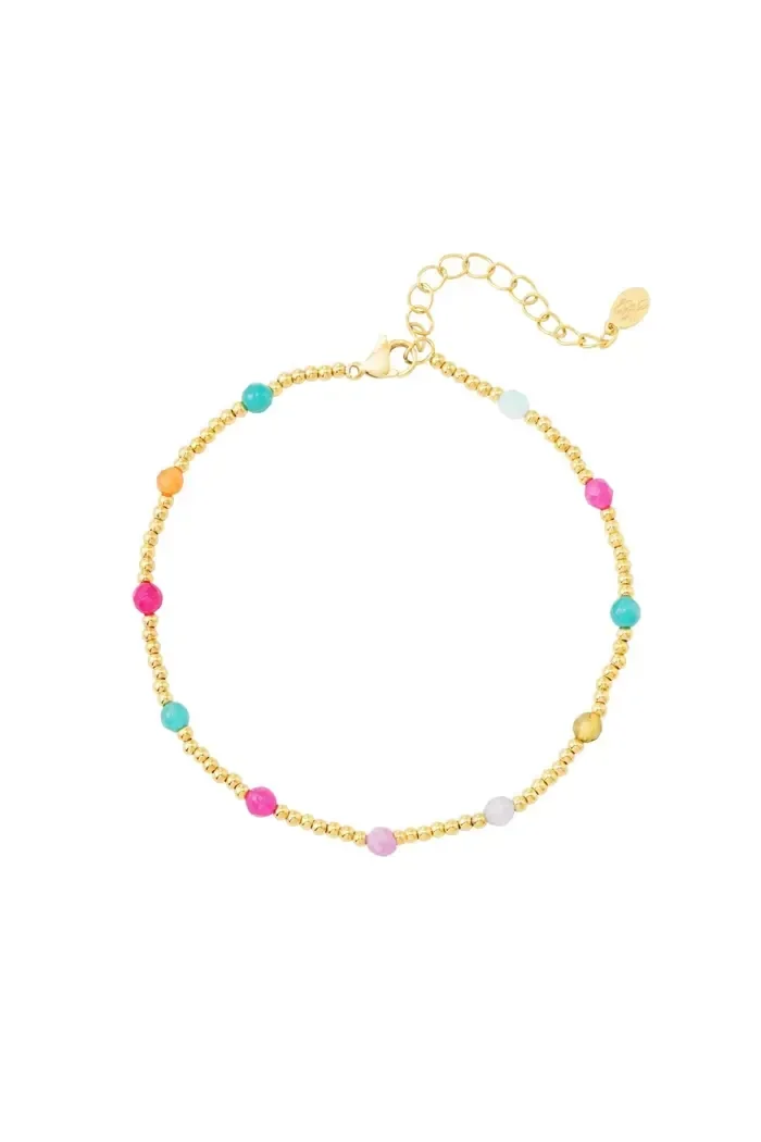 Enkelbandje goudkleur met gekleurde kraaltjes,