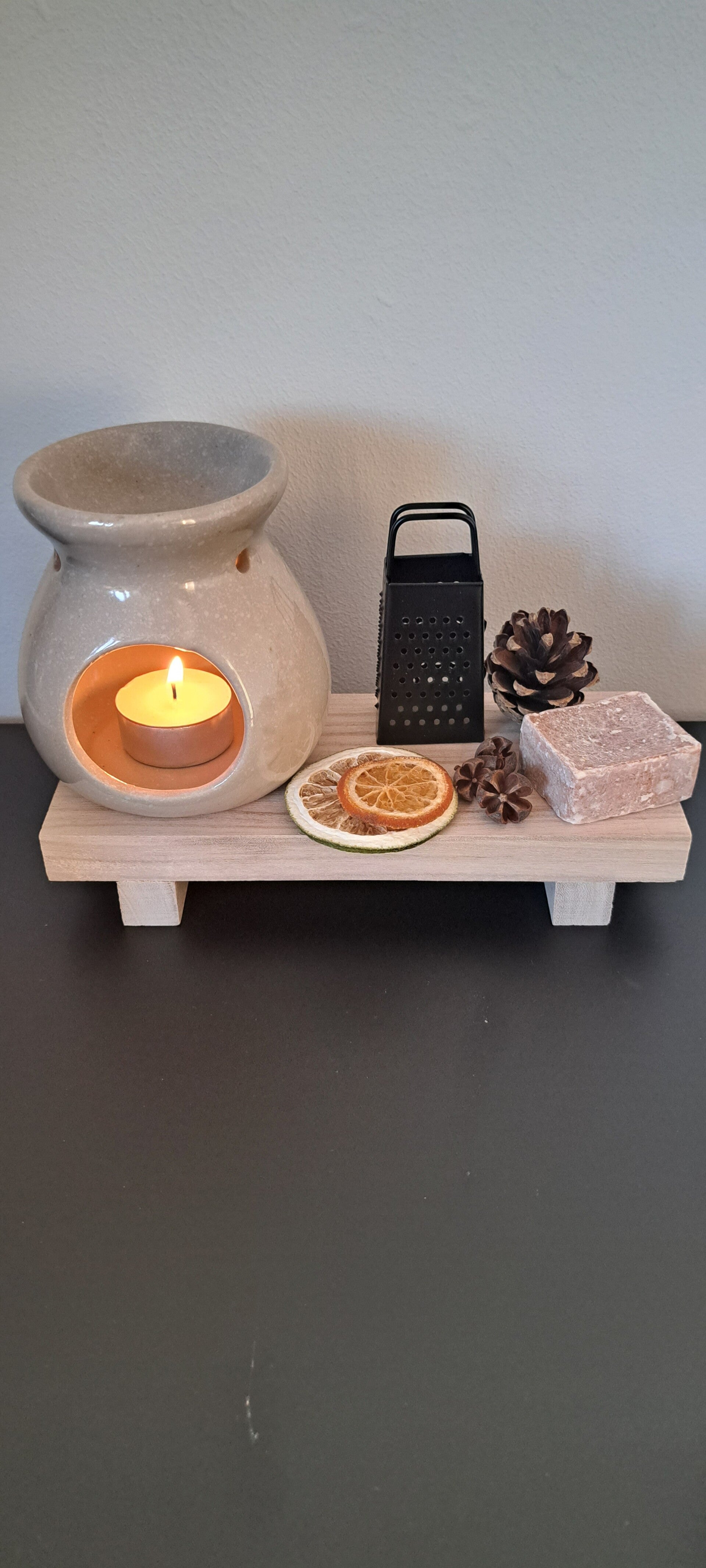 Gerubrander creme,rasp zwart,plateu en 1 geurblokje linnen.