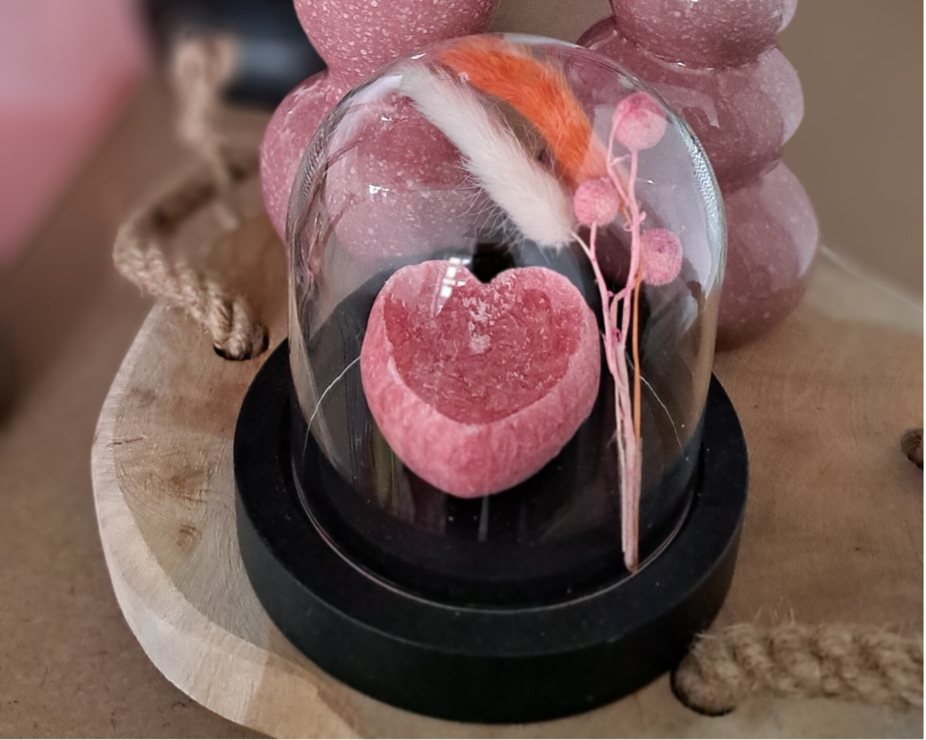 In de stolp zit een heerlijk geurblokje in de vorm van een hartje, en een leuk decoratie takje.