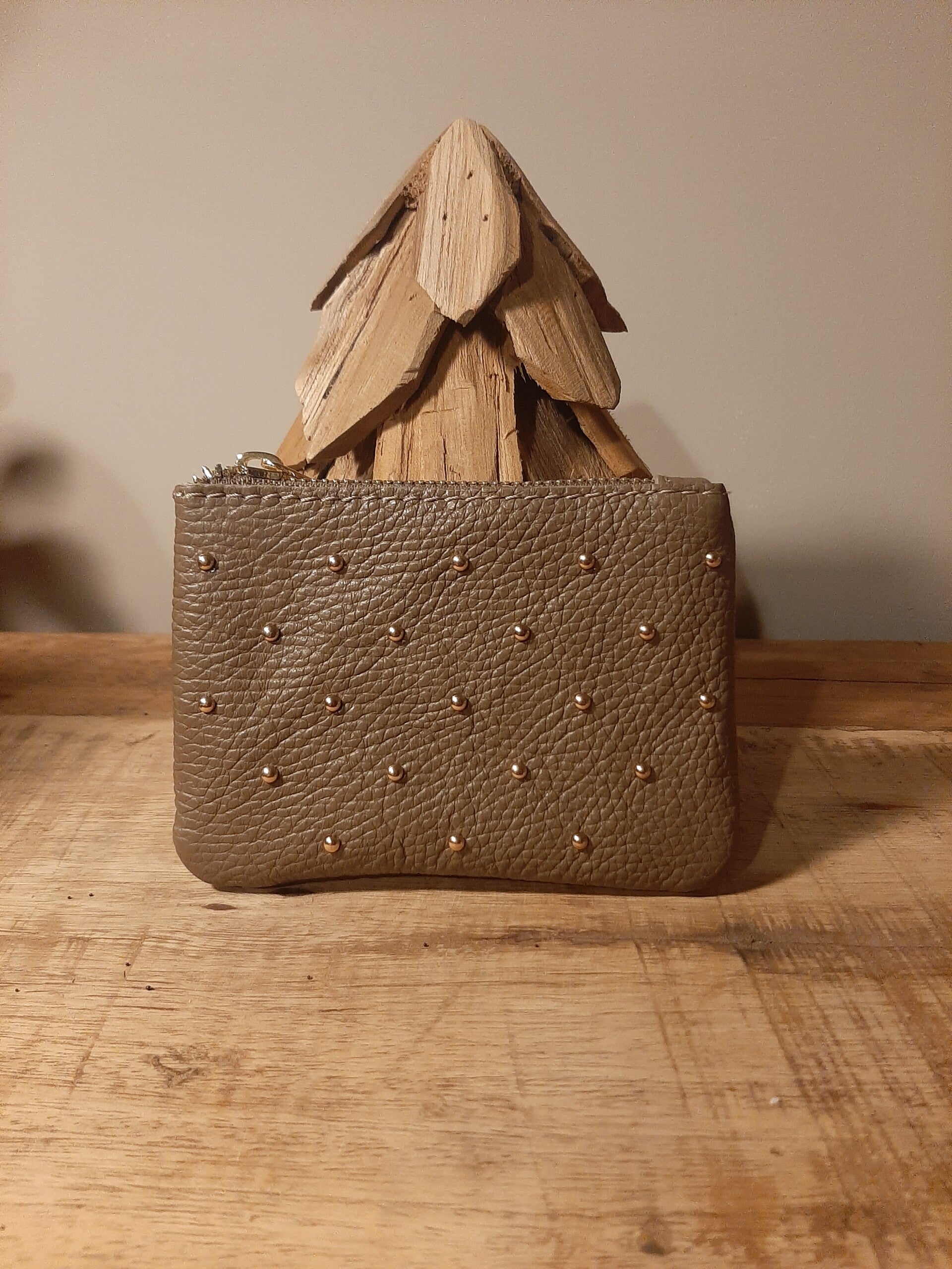 Dit schattige portemonneetje is super handig voor als je uit gaat!. Je neemt het handig mee in je tas. Taupe met gouden studs