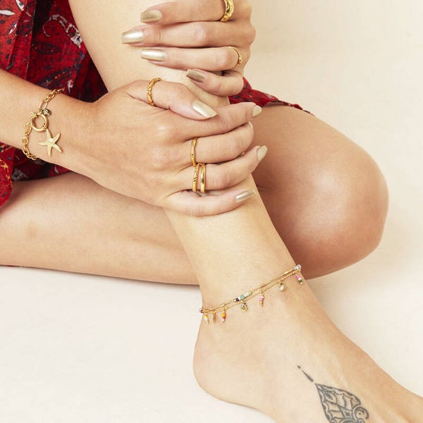 Dubbellaagse enkelband met kralen en bedels. Verkrijgbaar in verschillende kleuren.22+5 cm