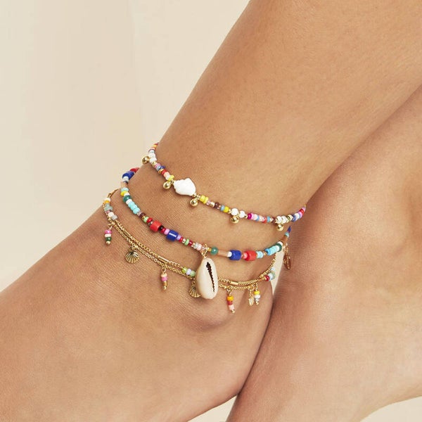 Enkelbandje met kleurrijke kralen en een schelp. Hier is ook een bijpassende armband bij. 22+5 cm