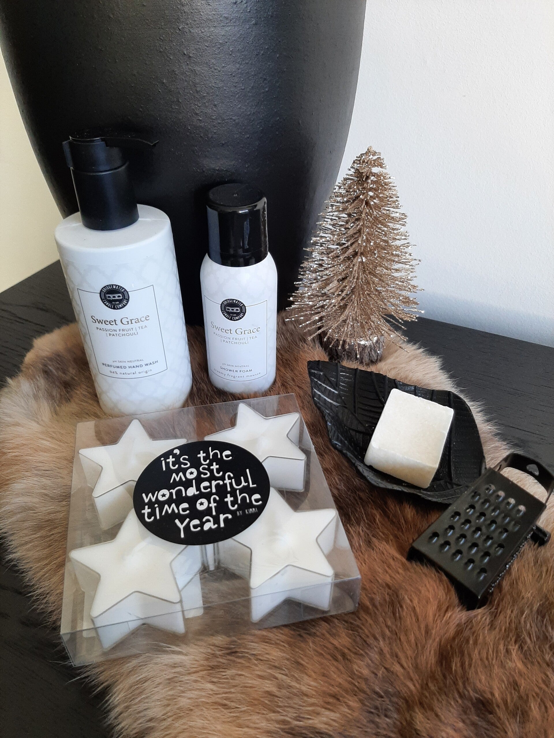 Handzeep,douchefoam,ster kaarsjes geurblokje met zwart schaaltje en rasp. We verpakken het feestelijk in voor u naar wens. Deze artikelen kunnen uiterraard ook los verkocht worden.